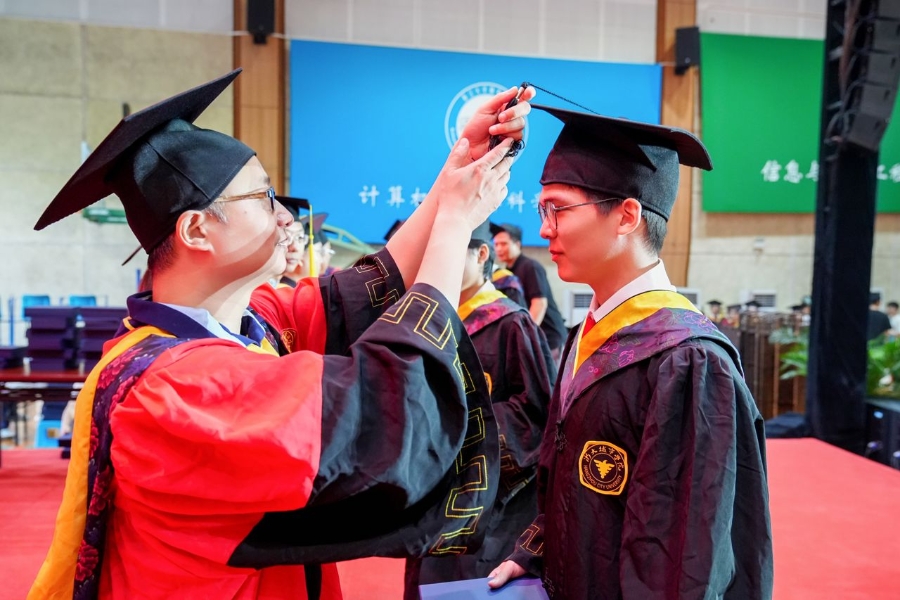 学位授予仪式在毕业典礼后隆重举行,师长为毕业生拨穗并合影留念。