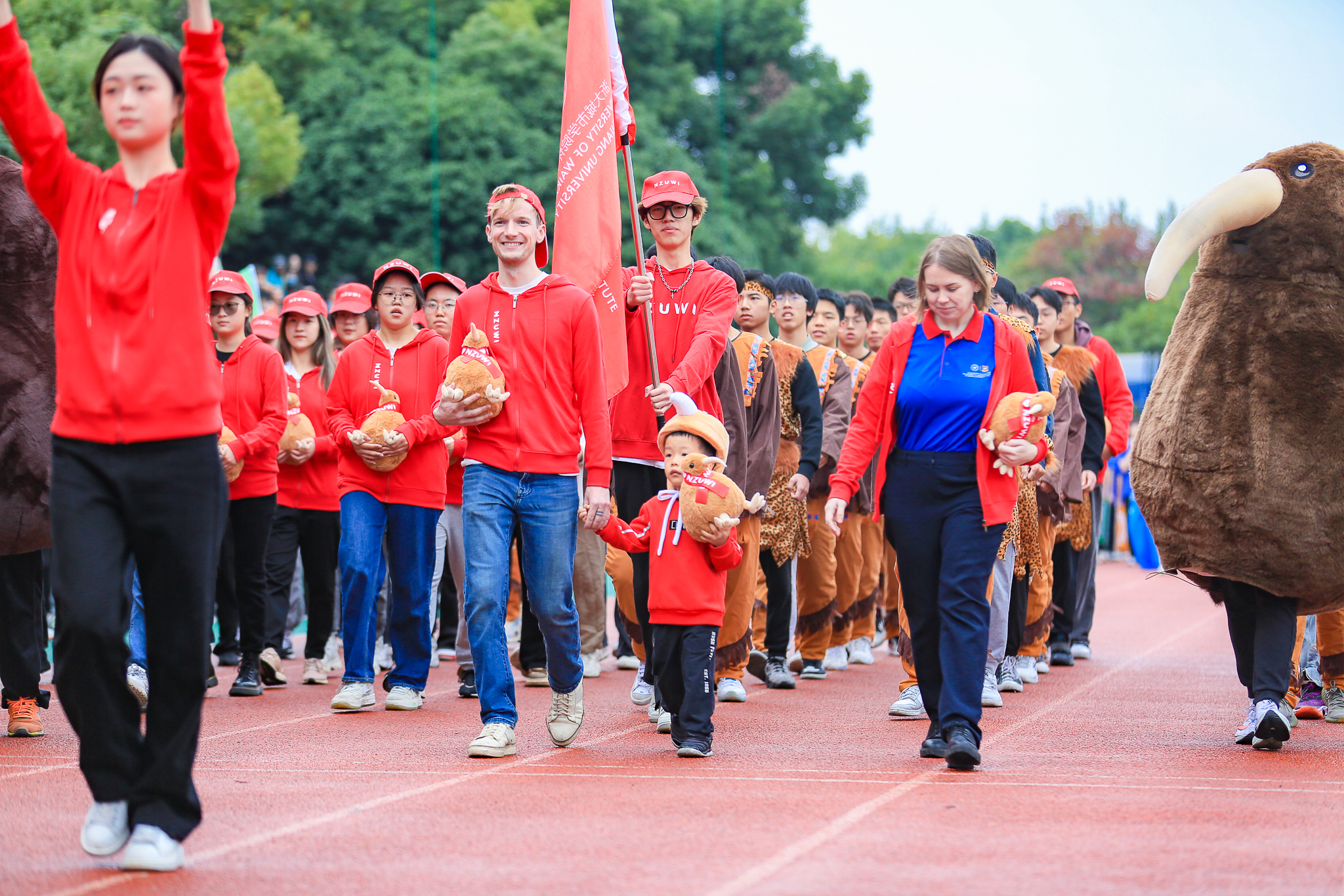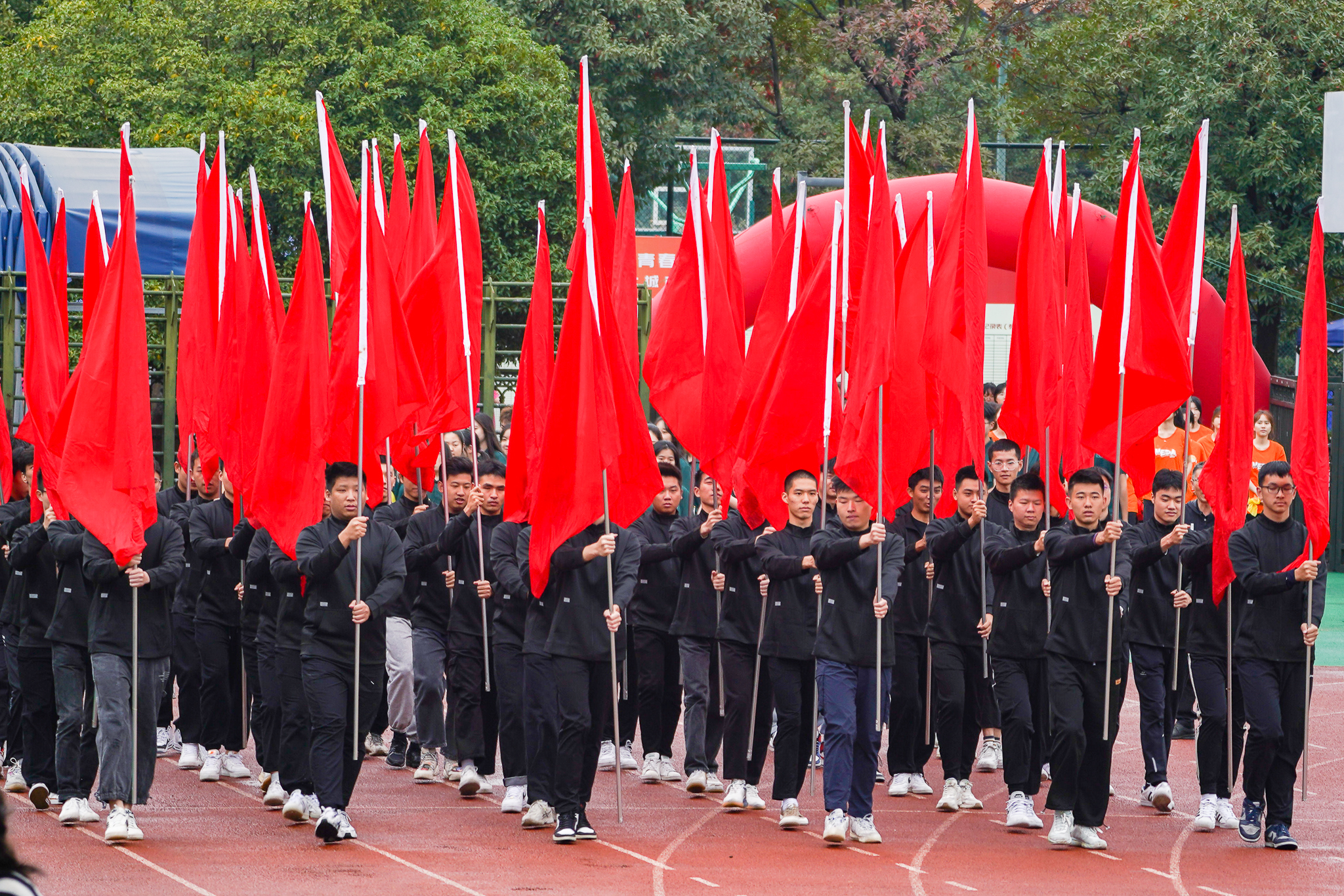 丹桂飘香,旌旗飘扬。在激昂的进行曲中,国旗队、校旗手、红旗队、由十二个学院组成的学生方队以及教工代表队相继入场。他们昂首阔步,英姿飒爽,热血涌动,以最饱满的姿态和最嘹亮的口号为运动会吹响启程的号角,彰显城院师生昂扬的斗志。